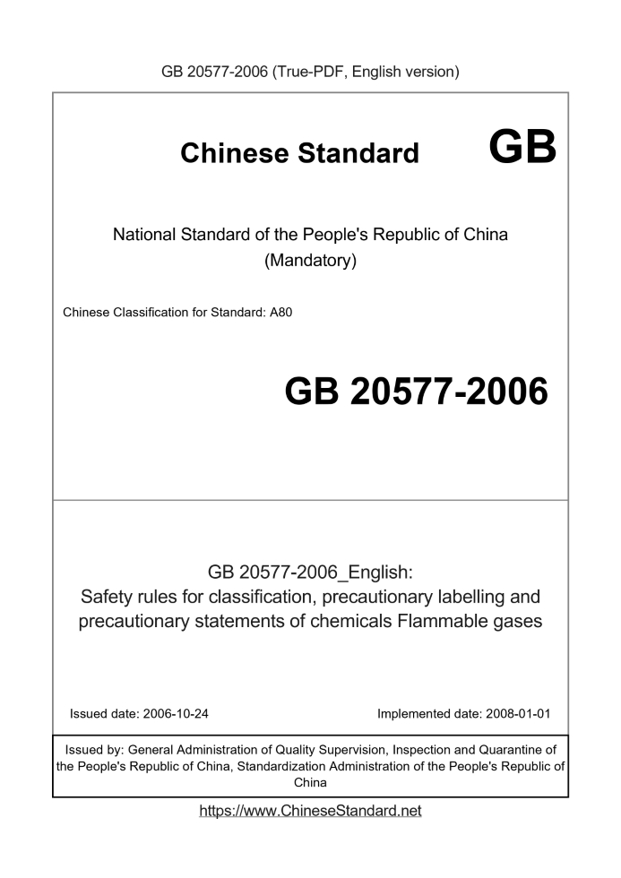 Delivery: <= 4 days. True-PDF full-copy in English will be manually translated and delivered via email. GB 20577-2006: Safety rules for classification, precautionary labelling and precautionary statements of chemicals Flammable gases Status: Obsolete