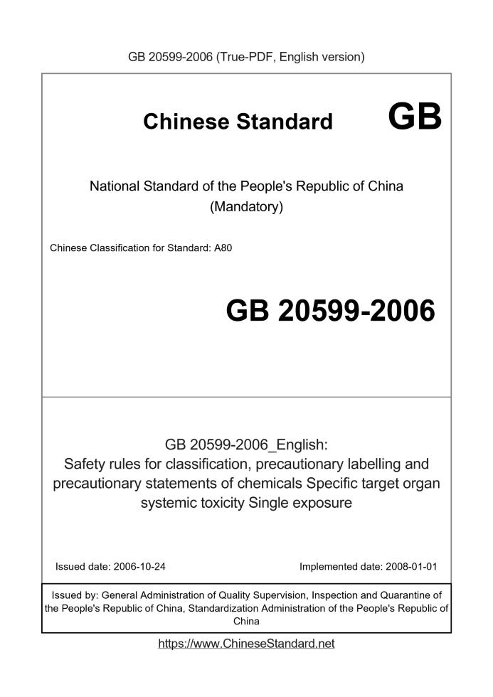 Delivery: <= 5 days. True-PDF full-copy in English will be manually translated and delivered via email. GB 20599-2006: Safety rules for classification, precautionary labelling and precautionary statements of chemicals Specific target organ systemic toxicity Single exposure Status: Obsolete