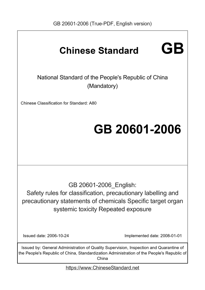 Delivery: <= 5 days. True-PDF full-copy in English will be manually translated and delivered via email. GB 20601-2006: Safety rules for classification, precautionary labelling and precautionary statements of chemicals Specific target organ systemic toxicity Repeated exposure Status: Obsolete