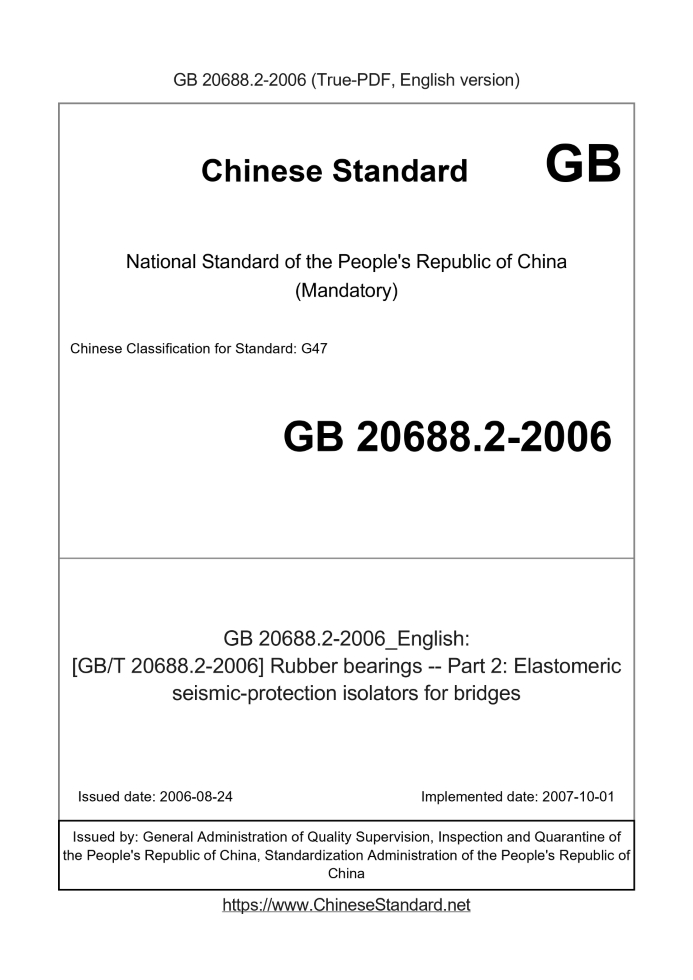 Delivery: <= 6 days. True-PDF full-copy in English will be manually translated and delivered via email. GB 20688.2-2006: [GB/T 20688.2-2006] Rubber bearings -- Part 2: Elastomeric seismic-protection isolators for bridges Status: Valid