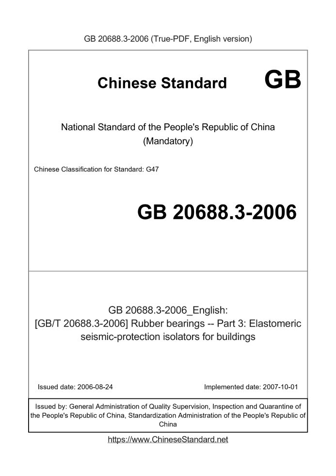 Delivery: <= 6 days. True-PDF full-copy in English will be manually translated and delivered via email. GB 20688.3-2006: [GB/T 20688.3-2006] Rubber bearings -- Part 3: Elastomeric seismic-protection isolators for buildings Status: Valid