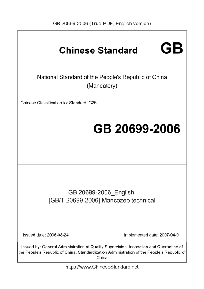 Delivery: <= 3 days. True-PDF full-copy in English will be manually translated and delivered via email. GB 20699-2006: [GB/T 20699-2006] Mancozeb technical Status: Obsolete