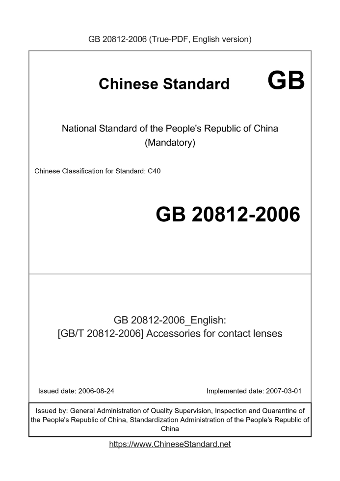Delivery: <= 3 days. True-PDF full-copy in English will be manually translated and delivered via email. GB 20812-2006: [GB/T 20812-2006] Accessories for contact lenses Status: Valid