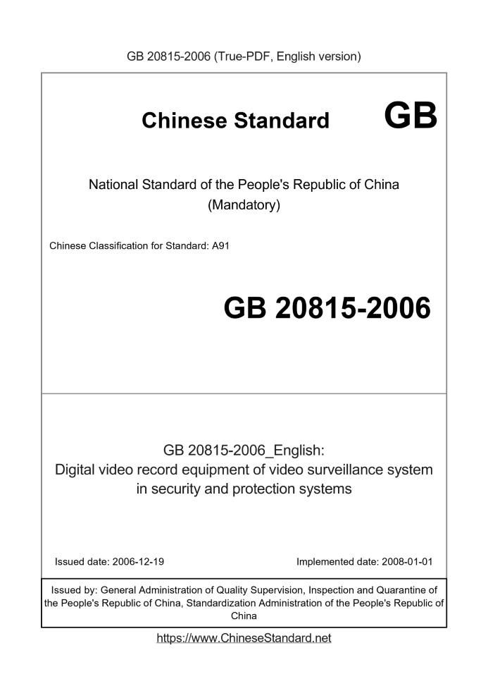 Delivery: <= 4 days. True-PDF full-copy in English will be manually translated and delivered via email. GB 20815-2006: Digital video record equipment of video surveillance system in security and protection systems Status: Valid