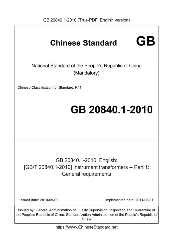 Delivery: <= 8 days. True-PDF full-copy in English will be manually translated and delivered via email. GB 20840.1-2010: [GB/T 20840.1-2010] Instrument transformers -- Part 1: General requirements Status: Valid