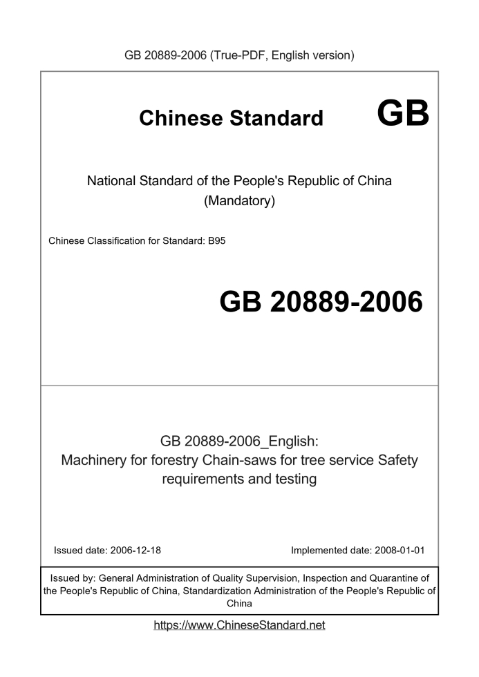 Delivery: <= 4 days. True-PDF full-copy in English will be manually translated and delivered via email. GB 20889-2006: Machinery for forestry Chain-saws for tree service Safety requirements and testing Status: Obsolete