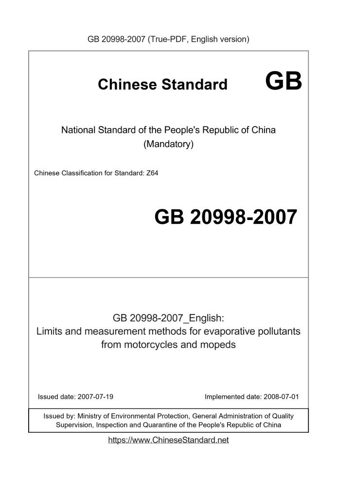 Delivery: <= 6 days. True-PDF full-copy in English will be manually translated and delivered via email. GB 20998-2007: Limits and measurement methods for evaporative pollutants from motorcycles and mopeds Status: Obsolete