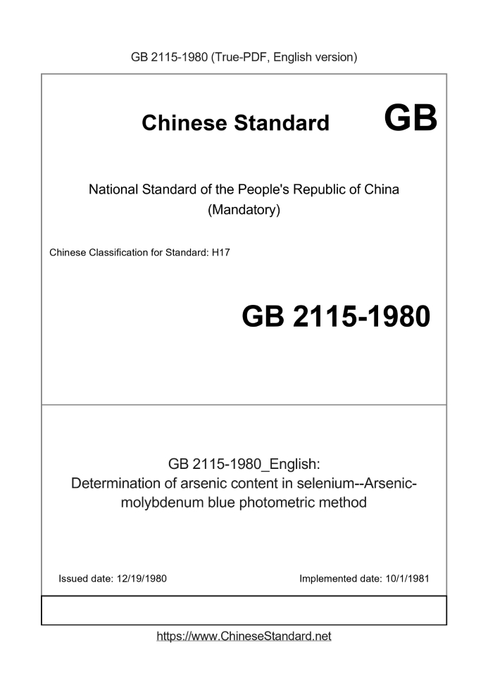 Delivery: <= 2 days. True-PDF full-copy in English will be manually translated and delivered via email. GB 2115-1980: Determination of arsenic content in selenium--Arsenic-molybdenum blue photometric method Status: Obsolete