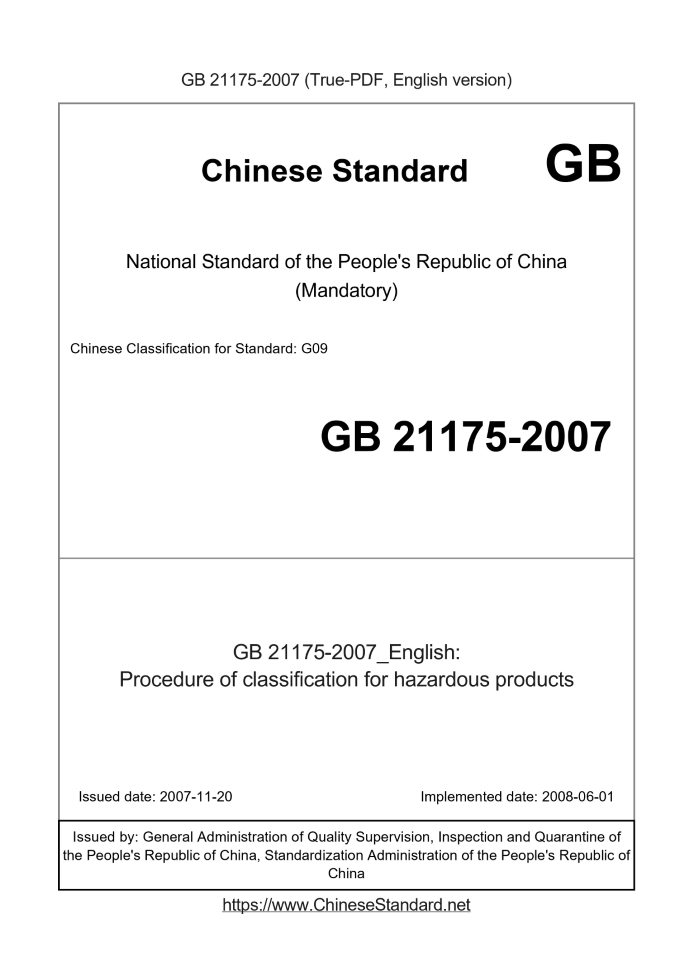 Delivery: <= 3 days. True-PDF full-copy in English will be manually translated and delivered via email. GB 21175-2007: Procedure of classification for hazardous products Status: Valid