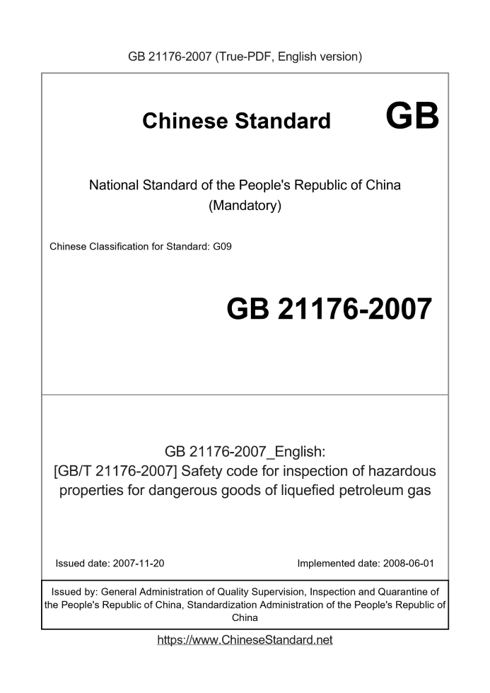 Delivery: <= 2 days. True-PDF full-copy in English will be manually translated and delivered via email. GB 21176-2007: [GB/T 21176-2007] Safety code for inspection of hazardous properties for dangerous goods of liquefied petroleum gas Status: Valid