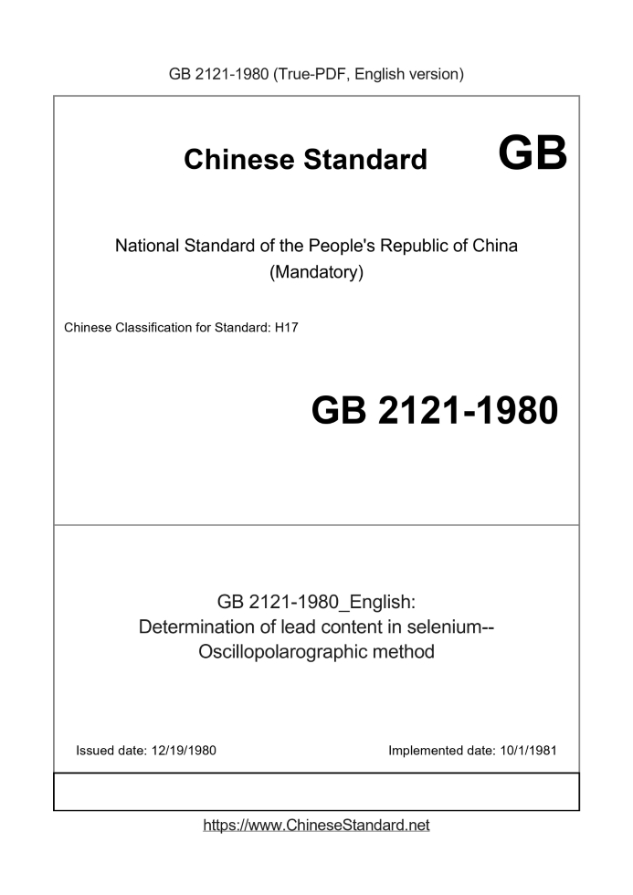 Delivery: <= 2 days. True-PDF full-copy in English will be manually translated and delivered via email. GB 2121-1980: Determination of lead content in selenium--Oscillopolarographic method Status: Obsolete