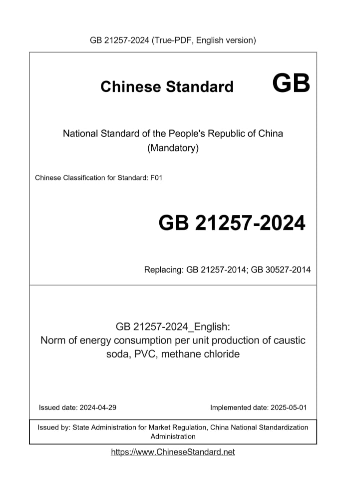 Delivery: <= 4 days. True-PDF full-copy in English will be manually translated and delivered via email. GB 21257-2024: Norm of energy consumption per unit production of caustic soda, PVC, methane chloride Status: Valid GB 21257: Historical versions