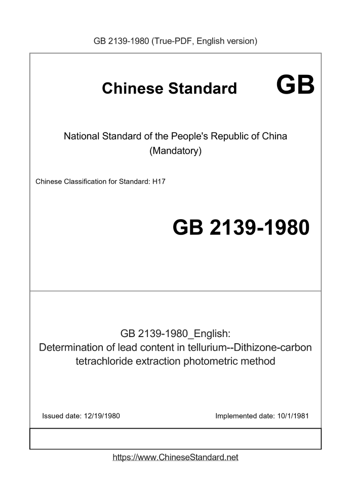 Delivery: <= 2 days. True-PDF full-copy in English will be manually translated and delivered via email. GB 2139-1980: Determination of lead content in tellurium--Dithizone-carbon tetrachloride extraction photometric method Status: Obsolete