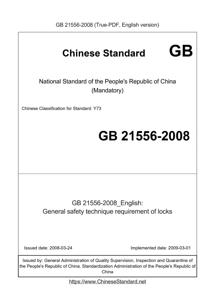 Delivery: <= 6 days. True-PDF full-copy in English will be manually translated and delivered via email. GB 21556-2008: General safety technique requirement of locks Status: Valid