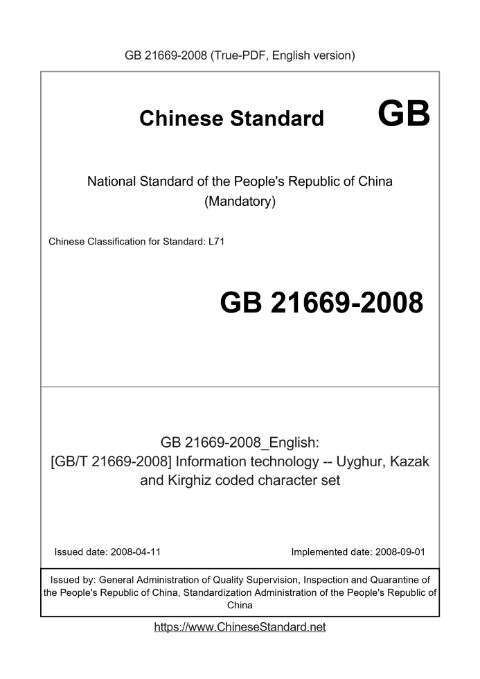 Delivery: <= 5 days. True-PDF full-copy in English will be manually translated and delivered via email. GB 21669-2008: [GB/T 21669-2008] Information technology -- Uyghur, Kazak and Kirghiz coded character set Status: Valid