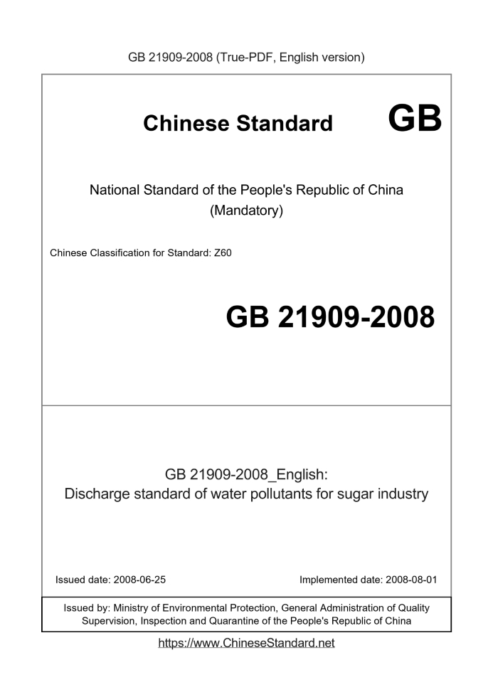 Delivery: <= 3 days. True-PDF full-copy in English will be manually translated and delivered via email. GB 21909-2008: Discharge standard of water pollutants for sugar industry Status: Valid
