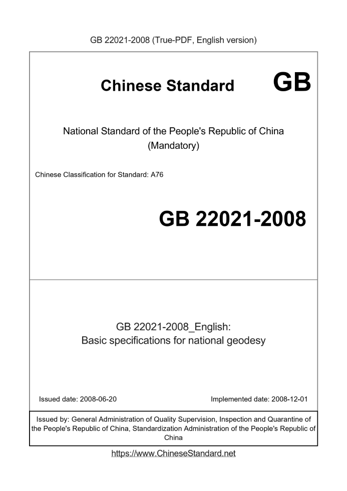 Delivery: <= 3 days. True-PDF full-copy in English will be manually translated and delivered via email. GB 22021-2008: Basic specifications for national geodesy Status: Valid