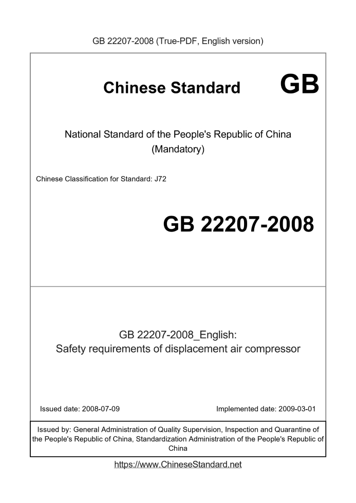 Delivery: <= 3 days. True-PDF full-copy in English will be manually translated and delivered via email. GB 22207-2008: Safety requirements of displacement air compressor Status: Valid