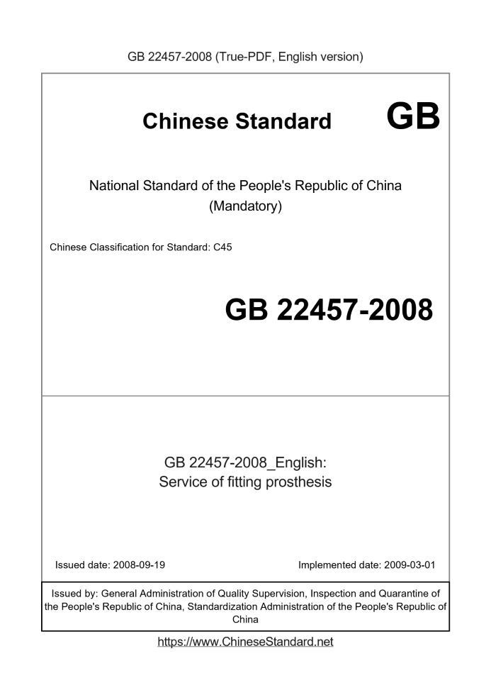Delivery: <= 5 days. True-PDF full-copy in English will be manually translated and delivered via email. GB 22457-2008: Service of fitting prosthesis Status: Valid
