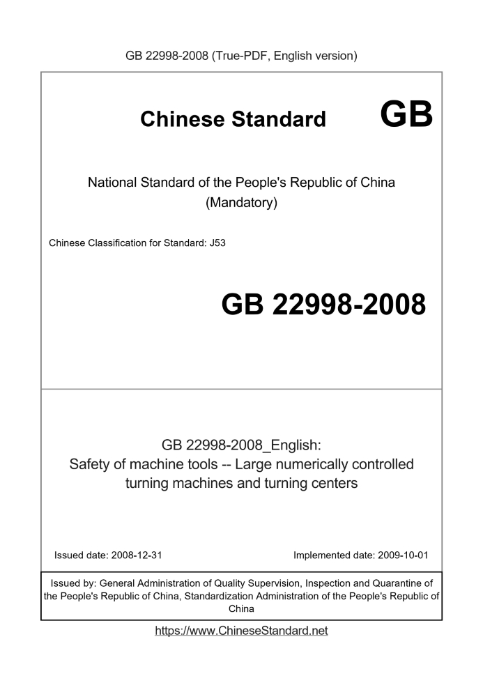 Delivery: <= 6 days. True-PDF full-copy in English will be manually translated and delivered via email. GB 22998-2008: Safety of machine tools -- Large numerically controlled turning machines and turning centers Status: Valid