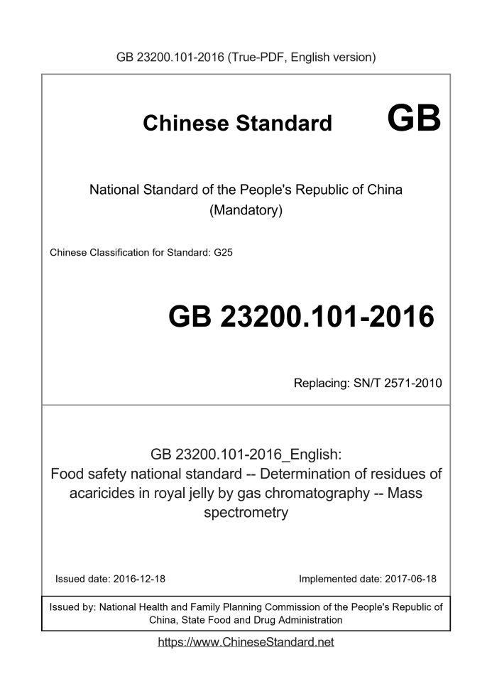 Delivery: <= 3 days. True-PDF full-copy in English will be manually translated and delivered via email. GB 23200.101-2016: Food safety national standard -- Determination of residues of acaricides in royal jelly by gas chromatography -- Mass spectrometry Status: Valid