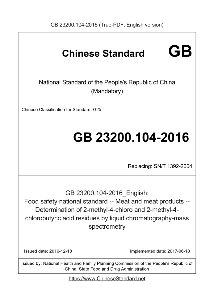 GB 23200.104-2016: Food safety national standard -- Meat and meat products -- Determination of 2-methyl-4-chloro and 2-methyl-4-chlorobutyric acid residues by liquid chromatography-mass spectrometry