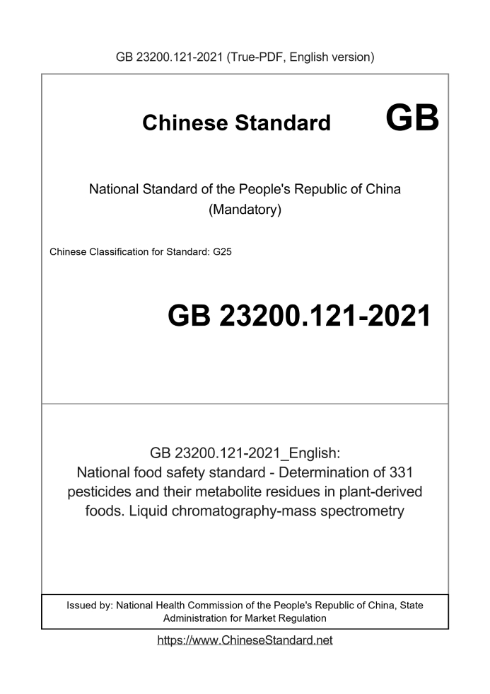 Delivery: <= 8 days. True-PDF full-copy in English will be manually translated and delivered via email. GB 23200.121-2021: National food safety standard - Determination of 331 pesticides and their metabolite residues in plant-derived foods. Liquid chromatography-mass spectrometry Status: Valid