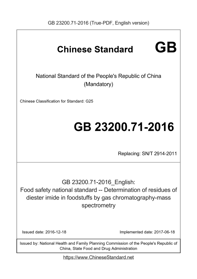 Delivery: <= 3 days. True-PDF full-copy in English will be manually translated and delivered via email. GB 23200.71-2016: Food safety national standard -- Determination of residues of diester imide in foodstuffs by gas chromatography-mass spectrometry Status: Valid