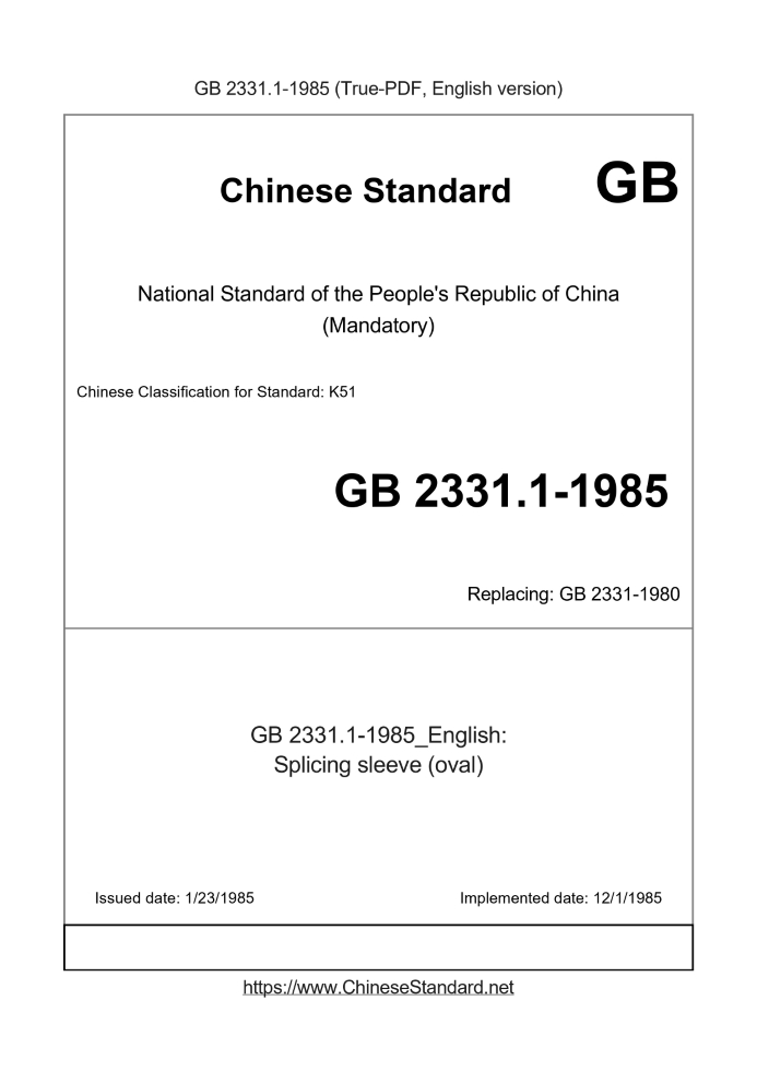 Delivery: <= 2 days. True-PDF full-copy in English will be manually translated and delivered via email. GB 2331.1-1985: Splicing sleeve (oval) Status: Obsolete