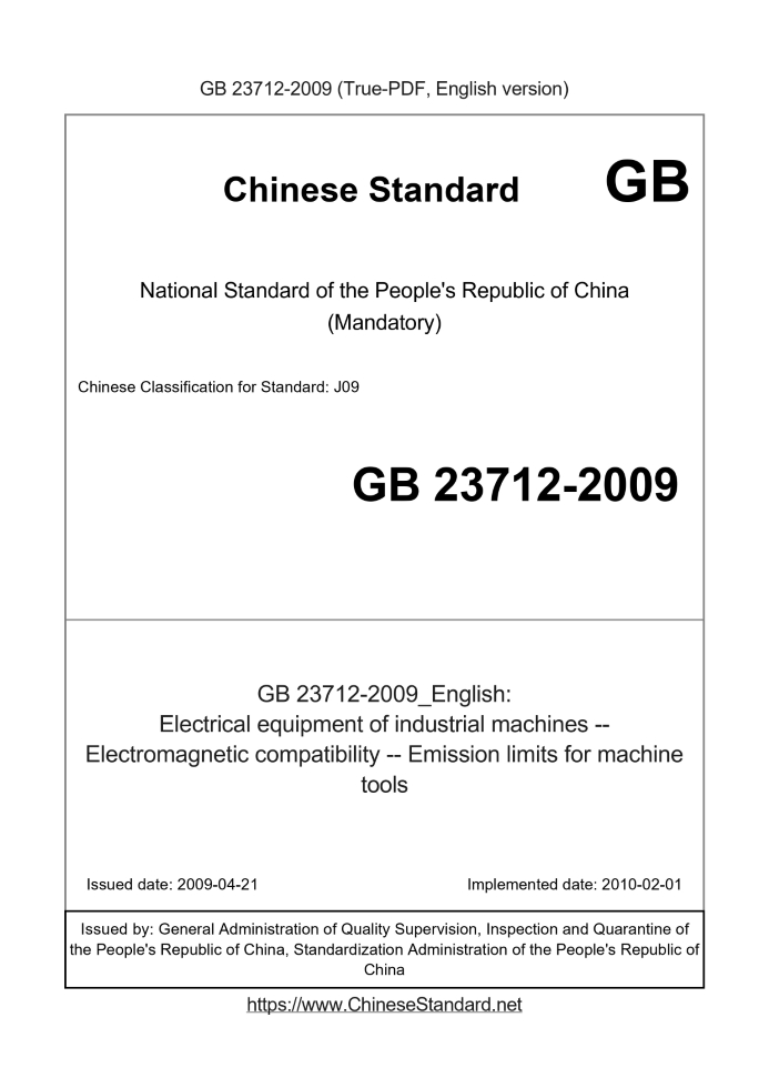 Delivery: <= 3 days. True-PDF full-copy in English will be manually translated and delivered via email. GB 23712-2009: Electrical equipment of industrial machines -- Electromagnetic compatibility -- Emission limits for machine tools Status: Valid