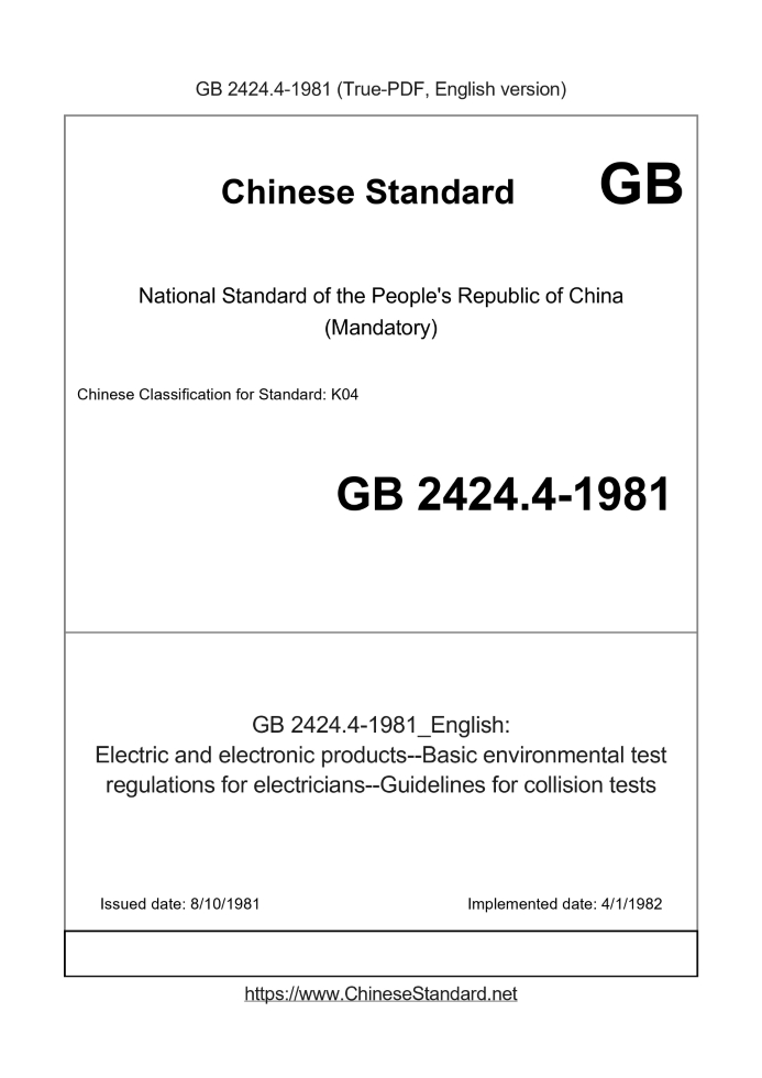 Delivery: <= 2 days. True-PDF full-copy in English will be manually translated and delivered via email. GB 2424.4-1981: Electric and electronic products--Basic environmental test regulations for electricians--Guidelines for collision tests Status: Obsolete