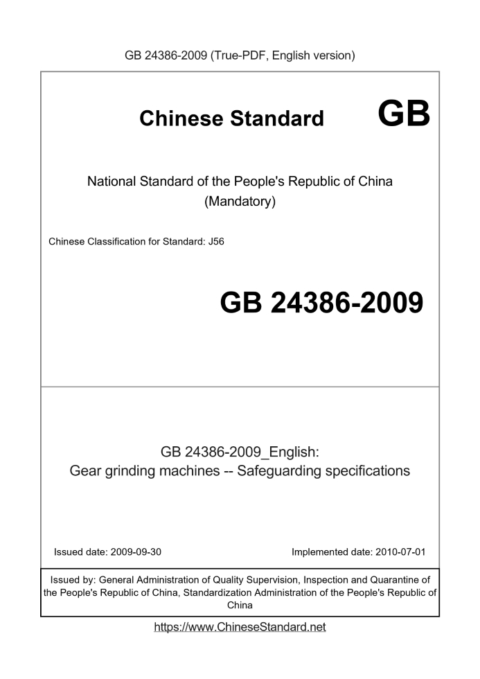 Delivery: <= 4 days. True-PDF full-copy in English will be manually translated and delivered via email. GB 24386-2009: Gear grinding machines -- Safeguarding specifications Status: Valid