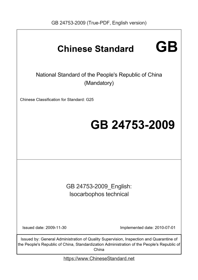 Delivery: <= 3 days. True-PDF full-copy in English will be manually translated and delivered via email. GB 24753-2009: Isocarbophos technical Status: Valid