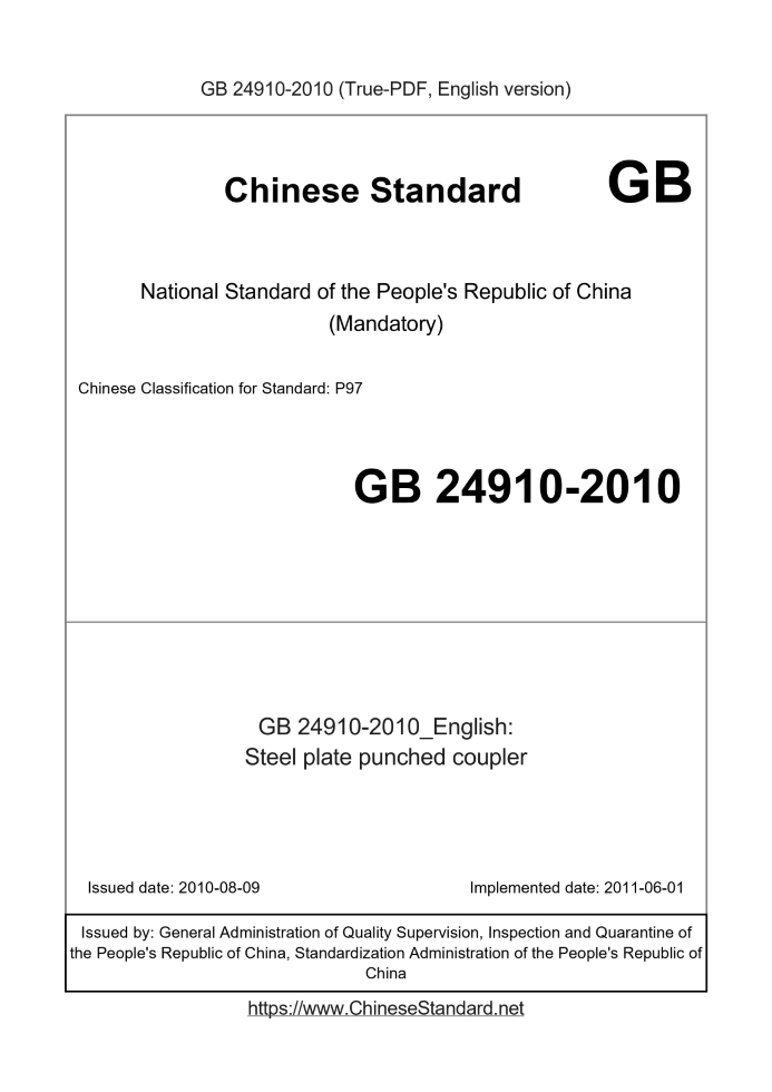 Delivery: <= 3 days. True-PDF full-copy in English will be manually translated and delivered via email. GB 24910-2010: Steel plate punched coupler Status: Valid