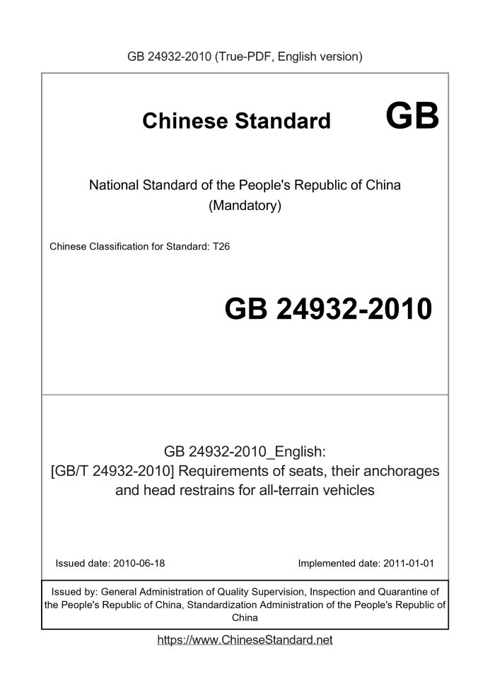 Delivery: <= 3 days. True-PDF full-copy in English will be manually translated and delivered via email. GB 24932-2010: [GB/T 24932-2010] Requirements of seats, their anchorages and head restrains for all-terrain vehicles Status: Valid