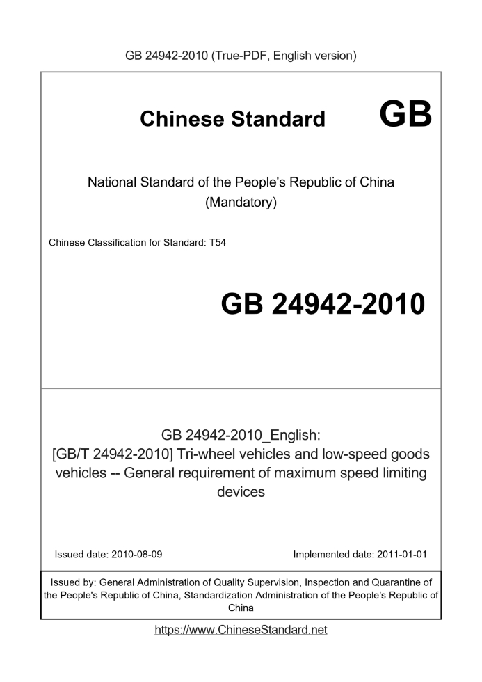 Delivery: <= 3 days. True-PDF full-copy in English will be manually translated and delivered via email. GB 24942-2010: [GB/T 24942-2010] Tri-wheel vehicles and low-speed goods vehicles -- General requirement of maximum speed limiting devices Status: Valid