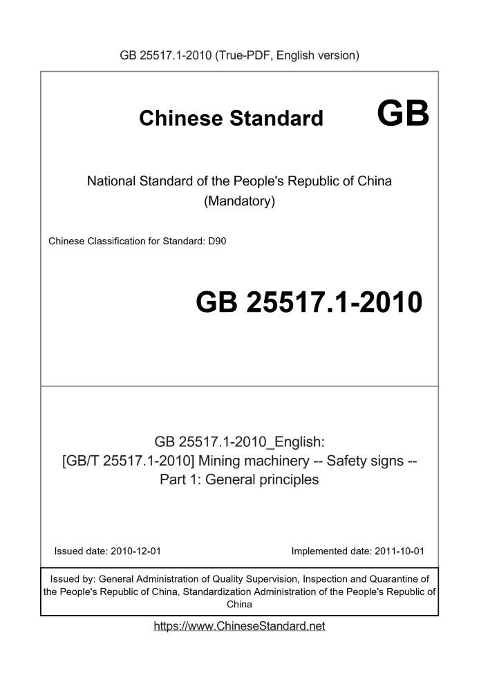 Delivery: <= 3 days. True-PDF full-copy in English will be manually translated and delivered via email. GB 25517.1-2010: [GB/T 25517.1-2010] Mining machinery -- Safety signs -- Part 1: General principles Status: Valid