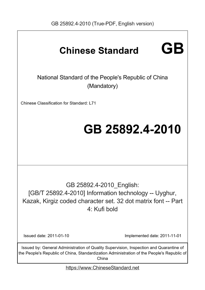 Delivery: <= 3 days. True-PDF full-copy in English will be manually translated and delivered via email. GB 25892.4-2010: [GB/T 25892.4-2010] Information technology -- Uyghur, Kazak, Kirgiz coded character set. 32 dot matrix font -- Part 4: Kufi bold Status: Valid