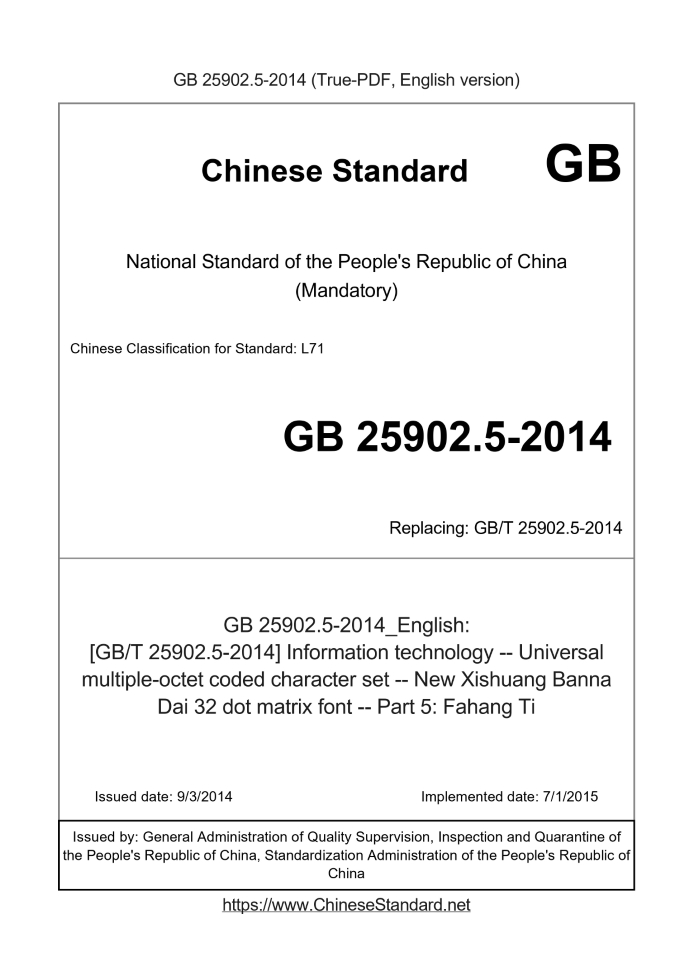 Delivery: <= 3 days. True-PDF full-copy in English will be manually translated and delivered via email. GB 25902.5-2014: [GB/T 25902.5-2014] Information technology -- Universal multiple-octet coded character set -- New Xishuang Banna Dai 32 dot matrix font -- Part 5: Fahang Ti Status: Valid GB 25902.5: Historical versions