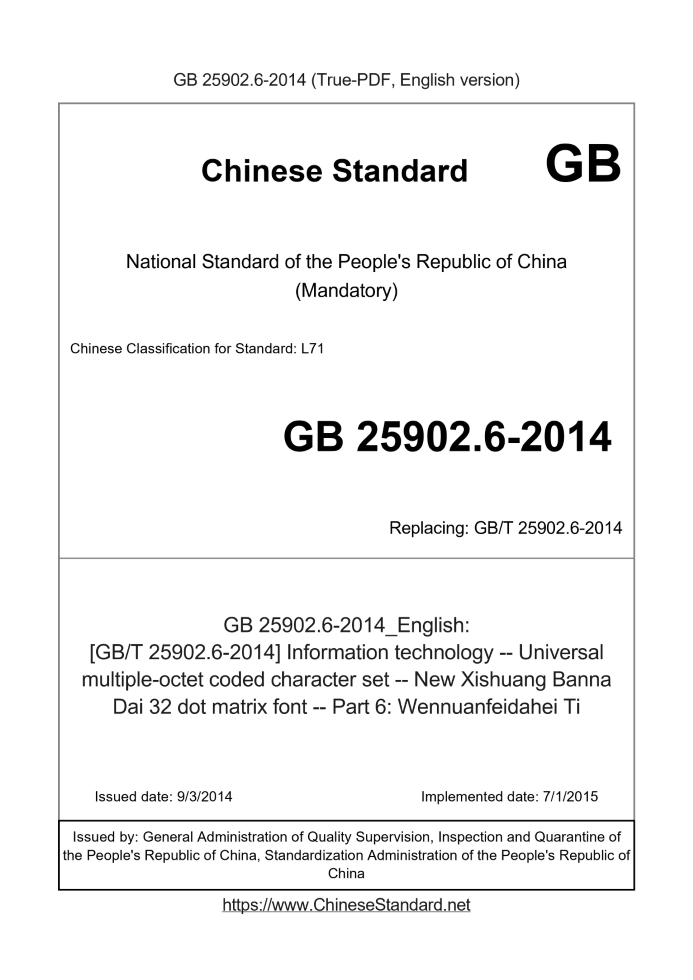Delivery: <= 3 days. True-PDF full-copy in English will be manually translated and delivered via email. GB 25902.6-2014: [GB/T 25902.6-2014] Information technology -- Universal multiple-octet coded character set -- New Xishuang Banna Dai 32 dot matrix font -- Part 6: Wennuanfeidahei Ti Status: Valid GB 25902.6: Historical versions