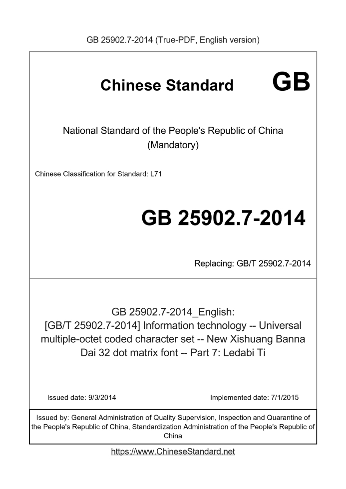 Delivery: <= 3 days. True-PDF full-copy in English will be manually translated and delivered via email. GB 25902.7-2014: [GB/T 25902.7-2014] Information technology -- Universal multiple-octet coded character set -- New Xishuang Banna Dai 32 dot matrix font -- Part 7: Ledabi Ti Status: Valid GB 25902.7: Historical versions