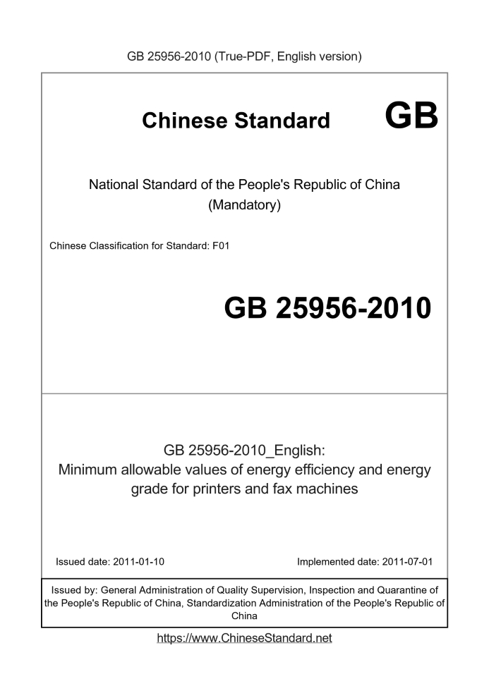 GB 25956-2010: Minimum allowable values of energy efficiency and energy grade for printers and fax machines