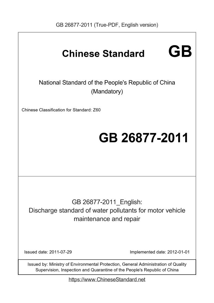 GB 26877-2011: Discharge standard of water pollutants for motor vehicle maintenance and repair