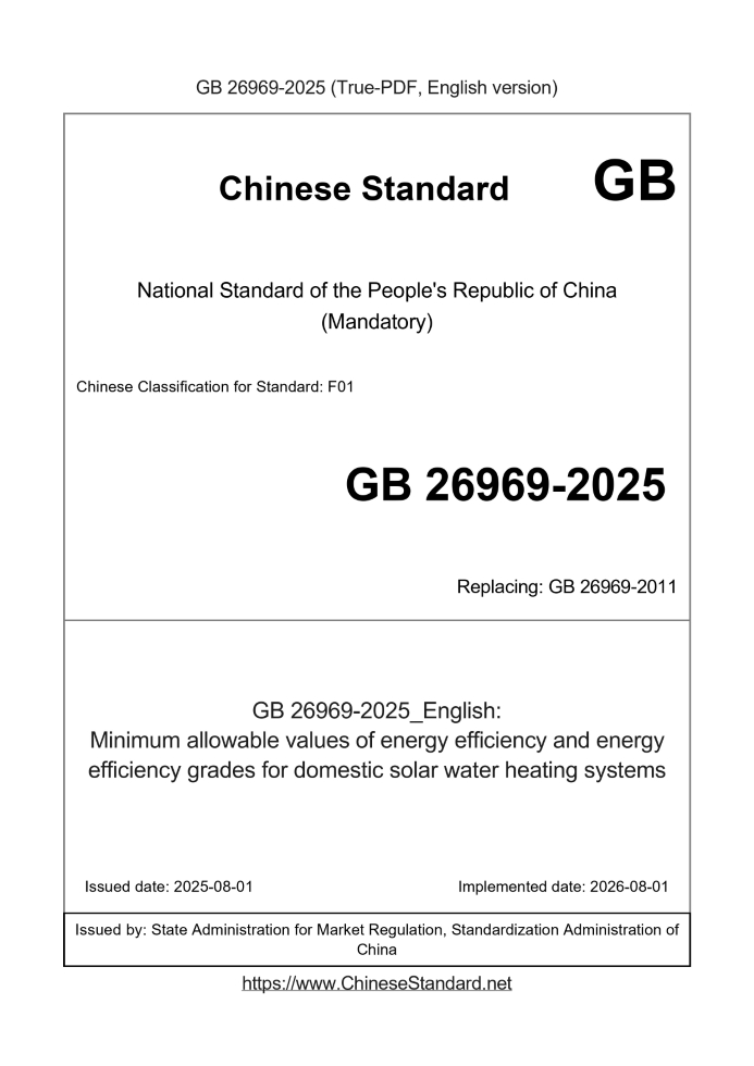 Delivery: <= 3 days. True-PDF full-copy in English will be manually translated and delivered via email. GB 26969-2025: Minimum allowable values of energy efficiency and energy efficiency grades for domestic solar water heating systems Status: Valid GB 26969: Historical versions