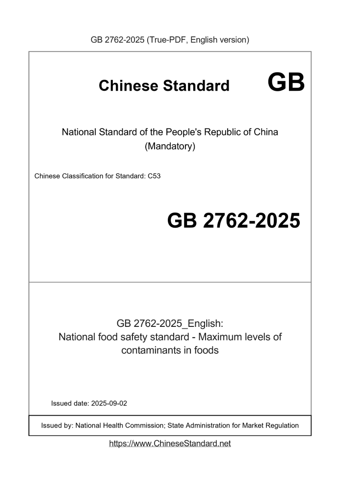 Basic dataStandard ID: GB 2762-2025 (GB2762-2025)Description (Translated English): National food safety standard - Maximum levels of contaminants in foods Sector / Industry: National Standard Classification of Chinese Standard: C53 Word Count Estimation: 22,210 Date of Issue: 2025-09-02 Issuing agency(ies): National Health Commission; State Administration for Market Regulation GB 2762-2025: National food safety standard - Maximum levels of contaminants in foods---This is an excerpt. Full copy of true-PDF in English version (including equations, symbols, images, flow-chart, tables, and figures etc.), auto-downloaded/delivered in 9 seconds, can be purchased online: https://www.ChineseStandard.net/PDF.aspx/GB2762-2025National Standards of the People's Republic of China National Food Safety Standards Limits of contaminants in food Published on 2025-09-02 Implemented on 2026-09-02 National Health Commission of the People's Republic of China State Administration for Market Regulation issued ForewordThis standard replaces GB 2762-2022 "National Food Safety Standard - Limits of Contaminants in Food" and its first amendment. Compared with GB 2762-2022, the main changes in this standard are as follows. ---The application principles have been modified; ---The limits for lead in dried meat products have been revised; ---The limits for cadmium in dried meat products have been revised; ---The limits for arsenic in dried meat products have been revised; ---The limits for chromium in dried meat products have been revised; ---The limits for nitrite in packaged drinking water (excluding natural mineral water) have been revised; ---The limit for nitrite in edible bird's nest has been increased; ---The descriptions of the indicators in Table 10 have been revised; ---Appendix A has been revised. National Food Safety Standards Limits of contaminants in food 1.Scope This standard specifies the substances in food that contain lead, cadmium, mercury, arsenic, tin, nickel, chromium, nitrite, nitrate, benzo[a]pyrene, N-dimethylnitrosamine, and poly(trimethylammonium chloride). Limits for chlorobiphenyl and 3-chloro-1,2-propanediol. 2.Terms and Definitions 2.1 Pollutants Food production, from crop cultivation, animal husbandry, and veterinary medicine, through processing, packaging, storage, transportation, and sales, to consumption, etc. Unintentionally added hazardous chemical substances generated during the process or introduced by environmental pollution. The pollutants specified in this standard refer to pollutants other than pesticide residues, veterinary drug residues, biotoxins, and radioactive substances. 2.2 Edible parts Food ingredients are removed from their non-edible state through mechanical means (such as grain milling, fruit peeling, nut shelling, meat deboning, fish deboning, shelling, etc.). After processing, the portion obtained is used for consumption. 2.3 Limited Edition The maximum permissible level of contaminants in food ingredients and/or the edible portion of finished food products. 3.Application Principles 3.1 Regardless of whether contaminant limits are established, food producers and processors should take control measures to ensure that the levels of contaminants in food are kept to a minimum. Low level. 3.2 This standard lists pollutants that may pose a significant risk to public health, and the food for which the limit values are set is based on the dietary exposure of consumers. Foods that have a significant impact. 3.3 The description of food categories (names) (see Appendix A) is used to define the scope of application of contaminant limits and applies only to this standard. When a certain contaminant... When a limit is applied to a specific food category (name), it applies to all food categories within that category (name), unless otherwise specified. except. 3.4 The limits for contaminants in food shall be calculated based on the normally edible portion of the food, unless otherwise specified. 3.5 For dried aquatic products and dried edible fungi, given that the limits apply to both fresh foods and their derivatives, the contamination levels in dried products... The contaminant limit should be calculated based on the corresponding contaminant limit in fresh food, combined with its dehydration rate or concentration rate. If the contaminant content in dried products is lower than... If the contaminant limits for its fresh raw materials are met, it can be determined that the requirements are met. Dehydration rate or concentration rate can be determined through food analysis and producer... The information provided and other available data shall be determined, unless otherwise specified. 4.Indicator Requirements 4.1 Lead 4.1.1 The lead limits in food are shown in Table 1. Table 1.Lead Limits in Food Food category (name) Limited edition (by Pb) mg/kg Grains and their products (excluding oatmeal, gluten, canned porridge, and filled/filled rice and wheat products) 0.2 Oatmeal, gluten, canned porridge, and stuffed (filled) rice and noodle products. 0.5 Vegetables and their products Fresh vegetables (excluding brassica vegetables, leafy greens, legumes, ginger, and potatoes) 0.1 Leafy vegetables 0.3 Brassica vegetables, legumes, ginger, and potatoes. 0.2 Vegetable products (excluding pickled vegetables and dried vegetables) 0.3 0.5g of pickled vegetables 0.8g of dried vegetables Fruits and their products Fresh fruit (excluding cranberries and currants) 0.1 Cranberries and currants 0.2 Fruit products [excluding jams (purses), candied fruits, and dried fruits] 0.2 Jam (puree) 0.4 Candied fruit 0.8 Dried fruit 0.5 Edible fungi and their products (button mushrooms, oyster mushrooms, shiitake mushrooms, hazel mushrooms, porcini mushrooms, matsutake mushrooms, truffles, green-headed mushrooms, termite mushrooms, chanterelles, succulent mushrooms) (Excluding milk fungus, wood ear fungus, silver ear fungus, and products made from the above edible fungi) 0.5 Products made from button mushrooms, o