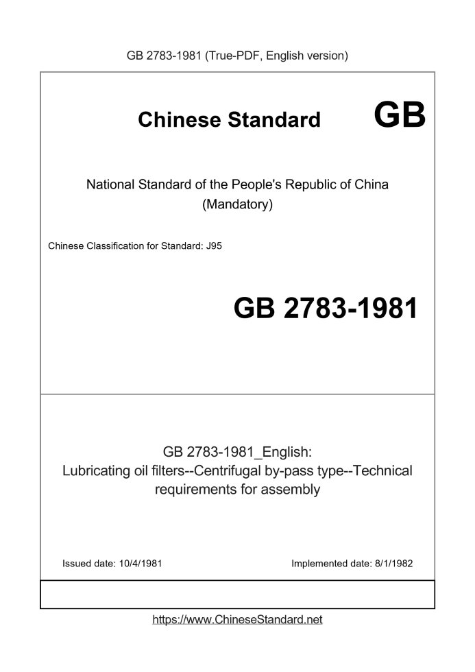 Standard ID: GB 2783-1981 (GB2783-1981)Description (Translated English): Lubricating oil filters--Centrifugal by-pass type--Technical requirements for assembly