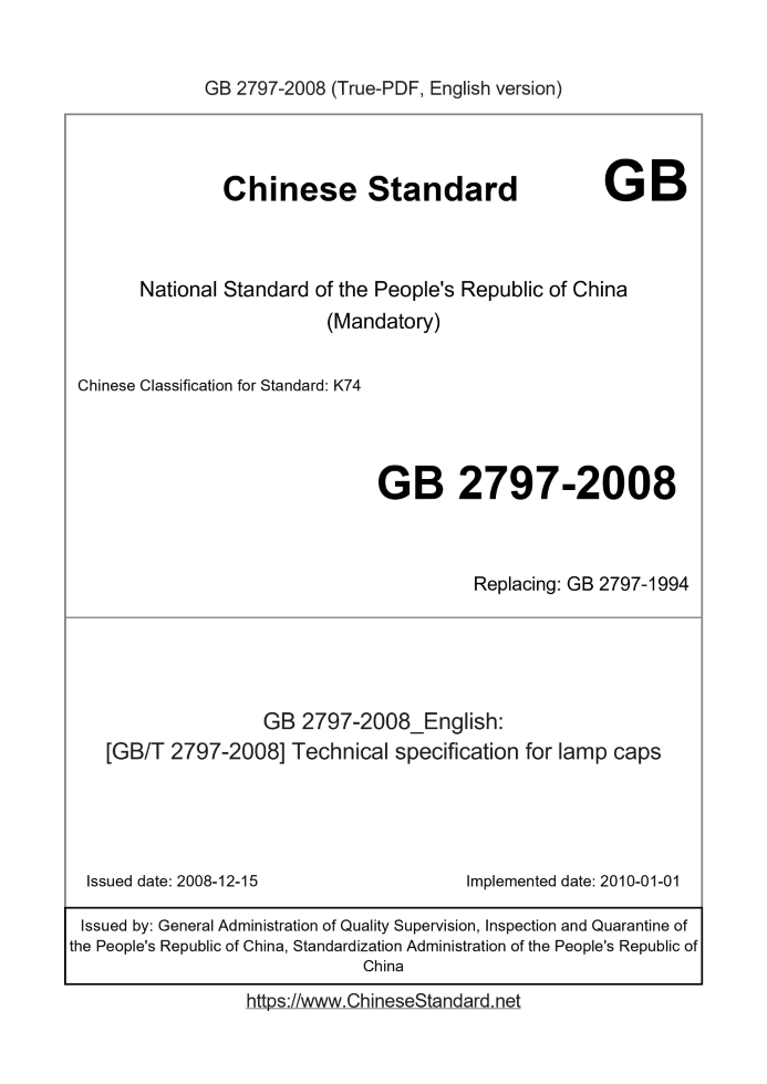 Delivery: <= 3 days. True-PDF full-copy in English will be manually translated and delivered via email. GB 2797-2008: [GB/T 2797-2008] Technical specification for lamp caps Status: Valid GB 2797: Historical versions