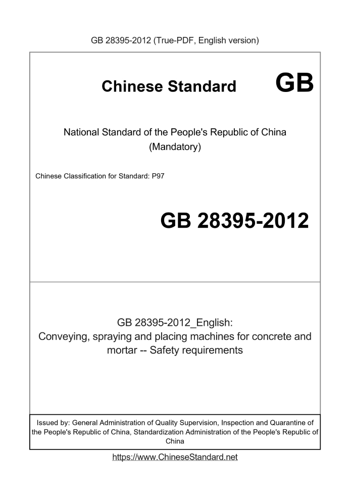 Delivery: <= 7 days. True-PDF full-copy in English will be manually translated and delivered via email. GB 28395-2012: Conveying, spraying and placing machines for concrete and mortar -- Safety requirements Status: Valid
