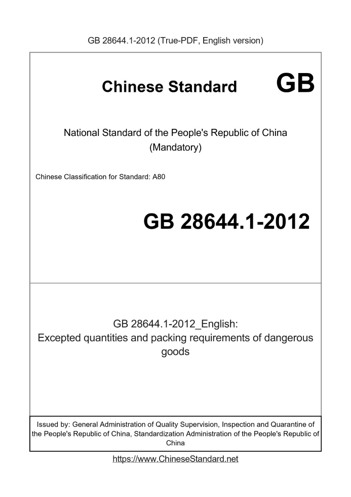 Delivery: <= 13 days. True-PDF full-copy in English will be manually translated and delivered via email. GB 28644.1-2012: Excepted quantities and packing requirements of dangerous goods Status: Valid