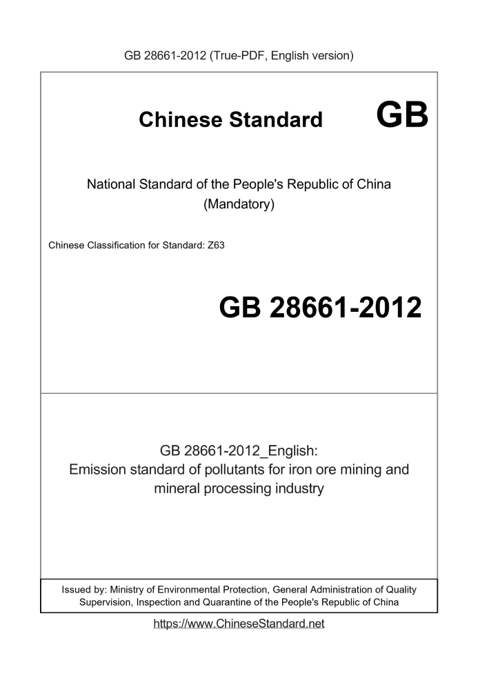 Delivery: <= 3 days. True-PDF full-copy in English will be manually translated and delivered via email. GB 28661-2012: Emission standard of pollutants for iron ore mining and mineral processing industry Status: Valid